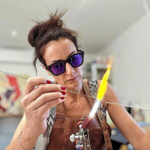 Ma première rencontre avec le verre : une visite d’une petite boutique en Dordogne, il y a plusieurs années. Une atmosphère incroyable y règne, remplie de couleurs, de gaieté et de bijoux plus incroyables les uns que les autres. De retour chez moi, je me suis documentée sur le travail de fileuse de verres. La transformation de la matière en fusion m’a profondément émue. Je retrouve cette sensation quand je vois naître de la flamme des perles de verre au chalumeau. Cette vocation ne m’ayant pas quittée, j’ai suivi une formation auprès d’une fileuse de verre. Autodidacte par la suite. Le filage est une technique rigoureuse et exigeante qui requiert la connaissance des différents degrés de fusion du verre. Ma formation d’ébéniste et mon attrait pour les matières nobles me prédestinaient certainement à cette rencontre. Aujourd’hui, je crée au gré de mes inspirations : une photo, un tissu, une fleur aux couleurs inspirantes. Offrir une création de perles en verre, c’est offrir un univers de transparence, de brillance et de couleurs.